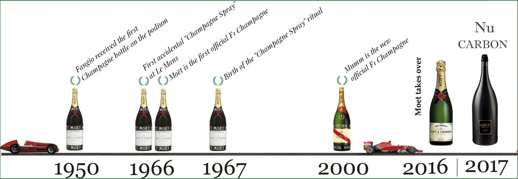 Men första kontakten mellan Grand Prix och Champagne daterar sig till 1950, när den första någonsin franska Grand Prix tävlingen hölls på Gueux-banan i Reims och då "El Chueco" Fangio vann. Eftersom racet gick bland de gröna vingårdarna och kullarna i regionen Champagne så presenteras vinnaren med en flaska för sin seger. Men för att se segraren spruta på publiken måste du gå framåt i tiden...över ett decennium till -66. I likhet med många stora traditioner, hände det för första gången av fullständig slump. Efter att ha vunnit Le Mans 24-timmars lopp 1966, sprutade Jo Siffert av misstag publiken med en flaska champagne som hade stått och blivit varm ute i solen, vilket gjorde att trycket ökade inuti magnumflaska och poff... Året därpå ska racerförare Dan Gurney medvetet ha kopierat Seifert gest när han och A. J. Foyt vann samma race och en tradition föddes! Flaskan finns nu hos All American Racers - AAR.