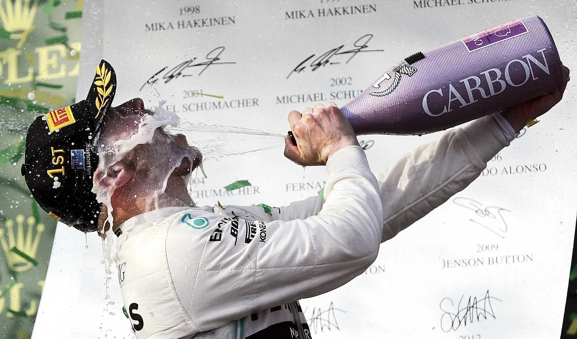 Moet & Chandon tog dock under 2016 över F1-sprutet efter Mumm men sedan 31 juli 2017 har nu champagne CARBON fått ansvaret att spruta! Champagne CARBON är gjord i en flaska med kolfiber precis som bilarna i F1 och är extremt dyr då den är specialgjord!